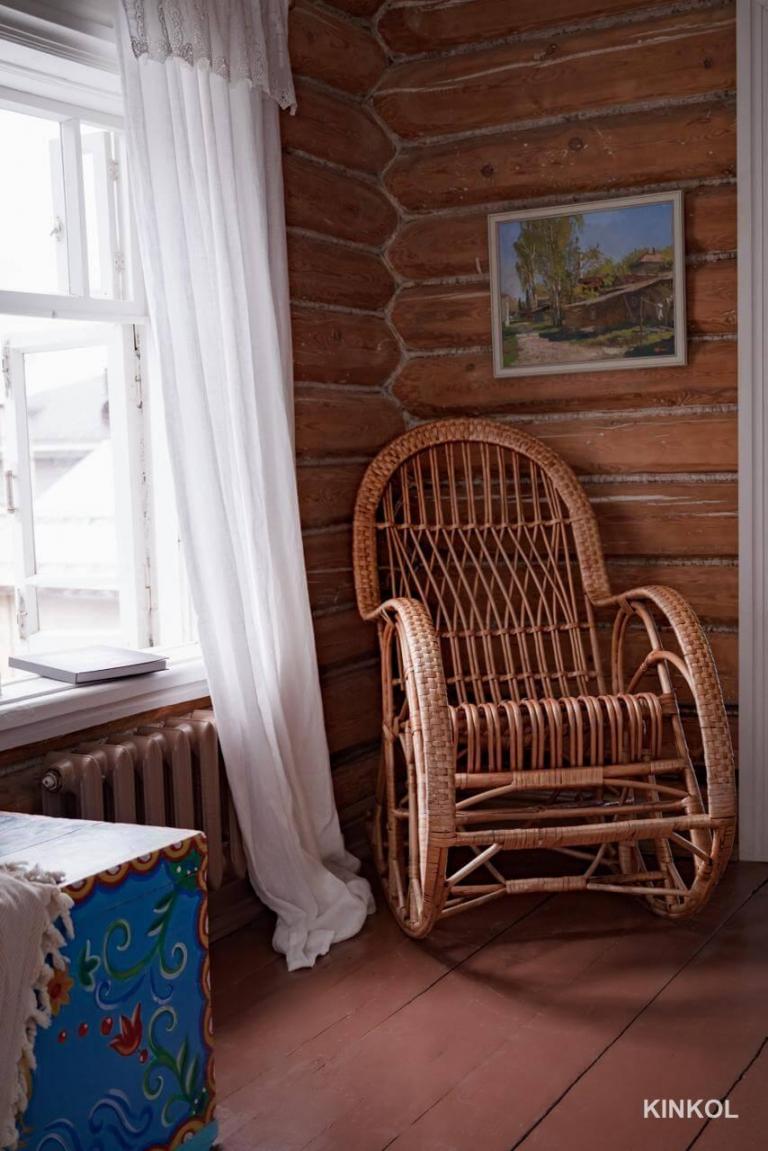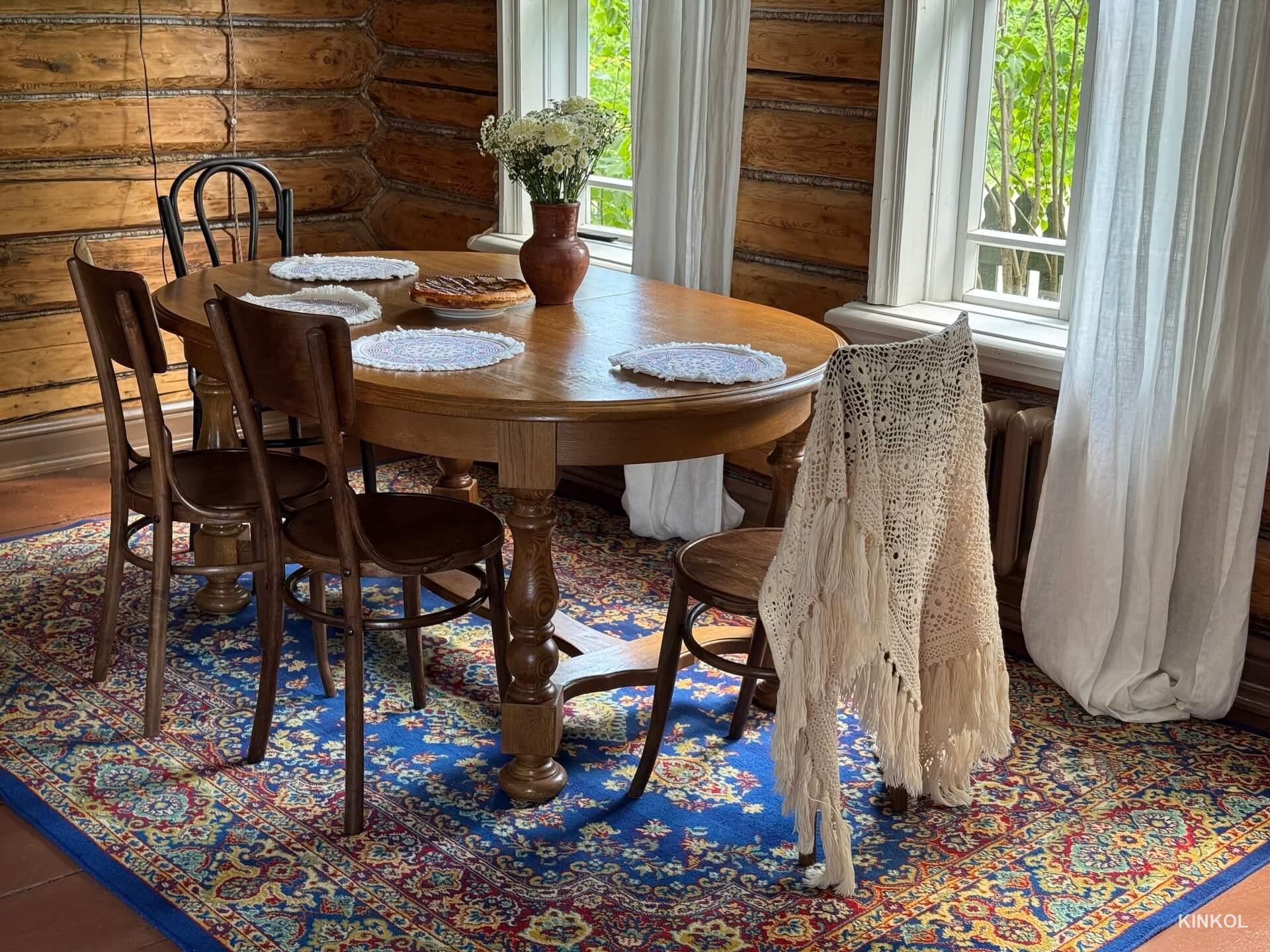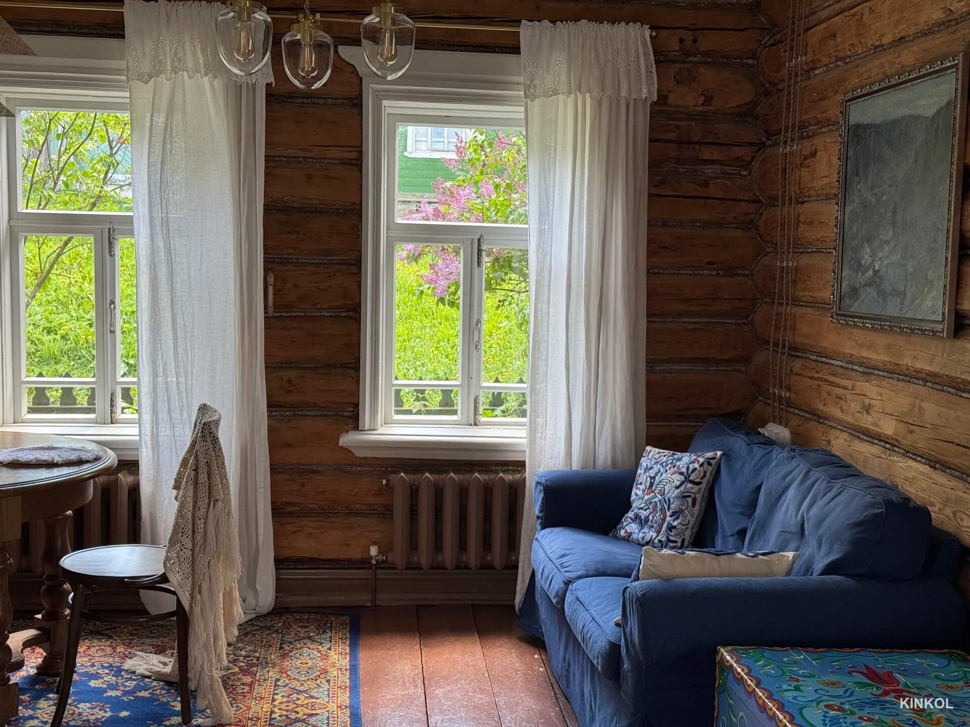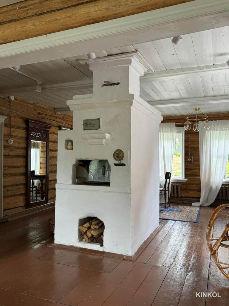 Mais le principal trésor de la maison est un véritable poêle russe, qui a été soigneusement restauré et peint. Il est situé au centre du salon, où se trouve également un canapé moelleux et une table en bois sculptée entourée de chaises viennoises.